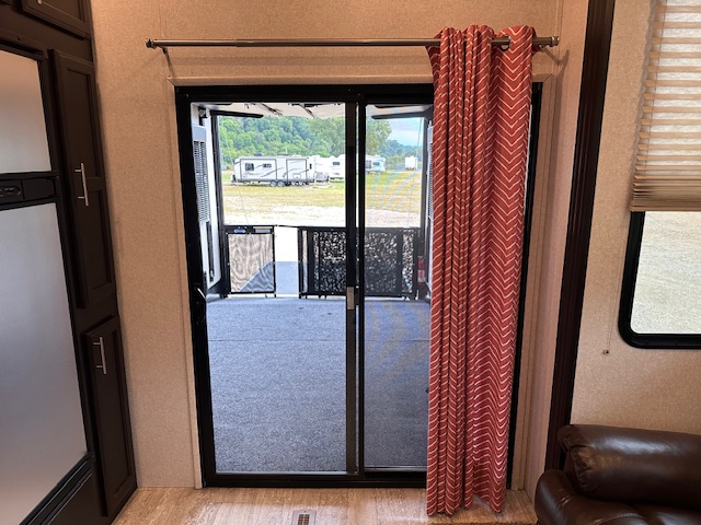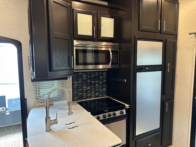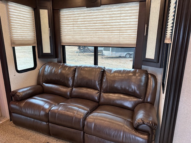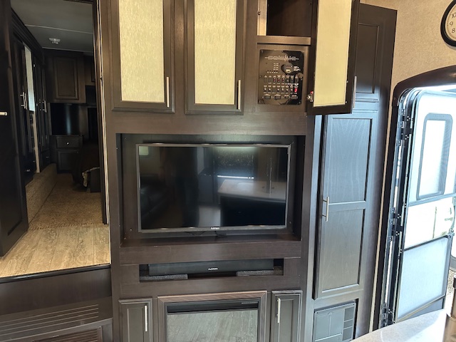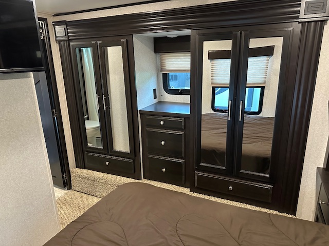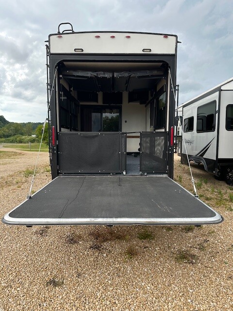 Toy hauler with 13′ garage. Drop down queen bed and with drop down dinette below it. King suite in the front of this trailer.